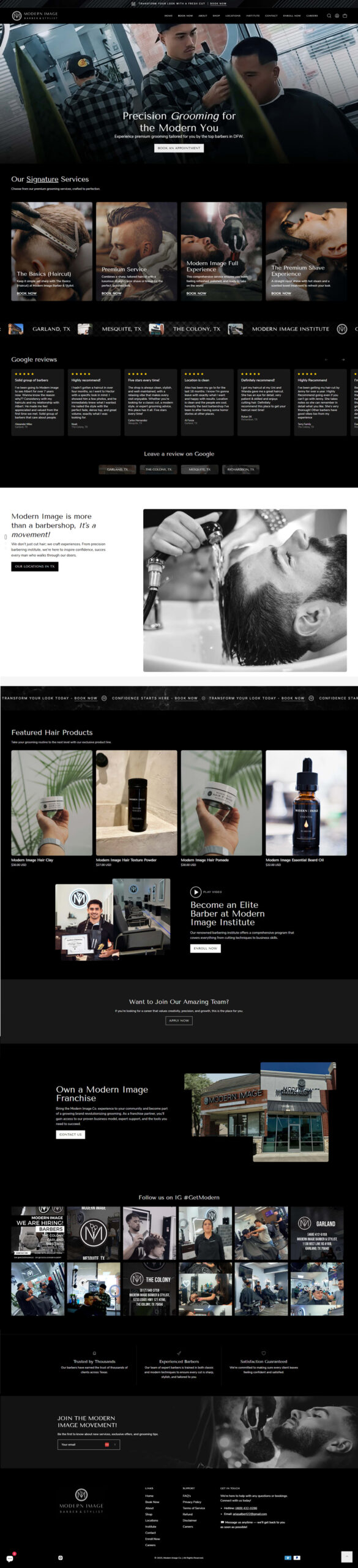 Built a mobile-optimized layout with engaging visuals, adding video hero section, streamlined the booking flow with clear CTAs, and created location-specific pages for easy navigation. The result is a clean, conversion-focused site that increased online appointments and positioned Modern Image as a premium barbershop brand.