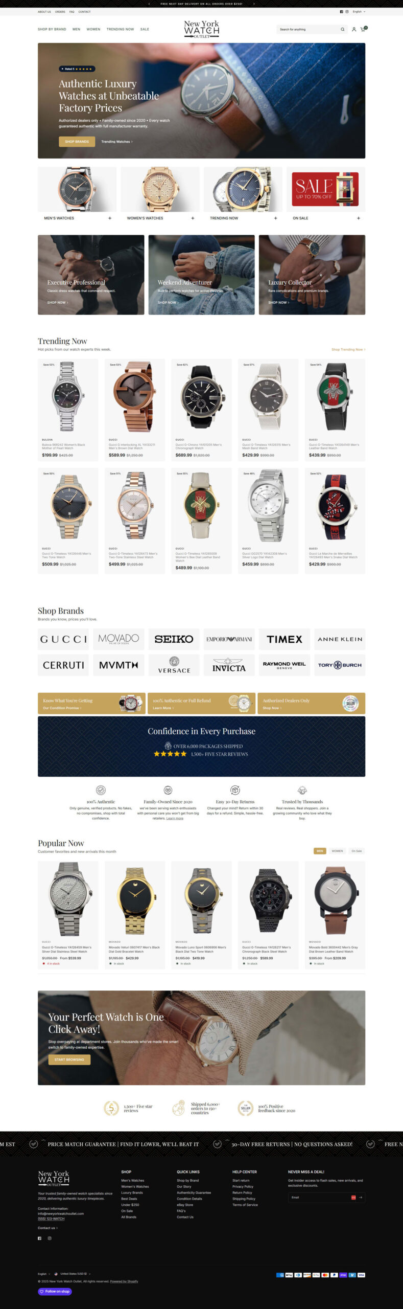 Added strategic trust elements throughout, and optimized for high-ticket conversions. The transformation positions his family-owned business as a credible luxury watch destination with a polished, professional storefront ready to compete with established retailers.